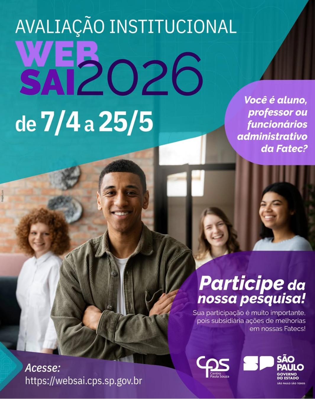 A pesquisa de avaliação institucional WebSai 2026 acontecerá de 07 de abril a 25 de maio de 2026. A participação de alunos, professores, equipes de gestão escolar e pedagógica, funcionários e corpo técnico-administrativo...