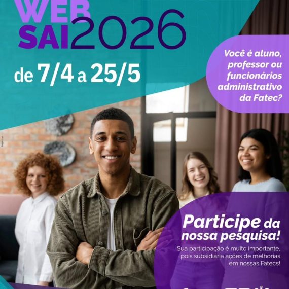 A pesquisa de avaliação institucional WebSai 2026 acontecerá de 07 de abril a 25 de maio de 2026. A participação de alunos, professores, equipes de gestão escolar e pedagógica, funcionários e corpo técnico-administrativo é muito importante. Acesse https://websai.cps.sp.gov.br/.